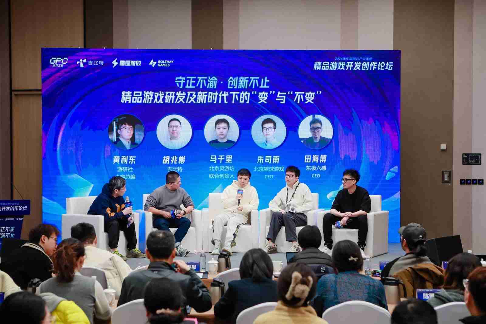 圆桌对话环节,,,在游研社内容总编黄利东的主持下,,,,亚星管理CTO胡兆彬、、、北京灵游坊联合创始人马千里、、、北京猩球游戏CEO朱司南、、东极六感CEO田海博等四位嘉宾围绕“守正不渝、、、创新不止——精品游戏研发及新时代下的‘变’与‘不变’”这一主题分享了各自在精品游戏开发理念及工程能力搭建方面的见解和经历,,并就行业变化下游戏人需要坚守的理念等展开交流探讨。。。。